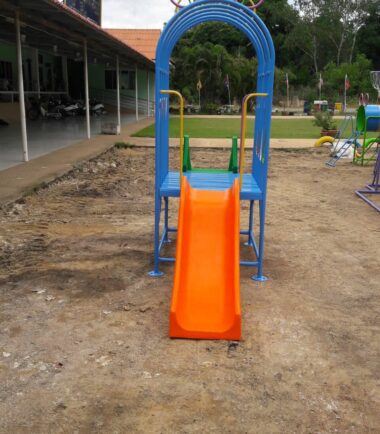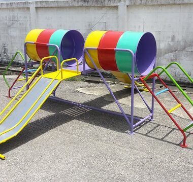 มี 2 ขั้นบันได มีถังลอดเอาไว้นั่งเล่น มีบันไดลื่นทำจากสแตนเลสเหมาะสำหรับเด็กเล็ก